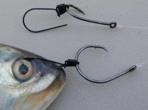 The small size bridles are perfect for small and medium baits. You can also use the small bridles, as we often do, on baits such as bunker. We simply penetrate the baits in the nostril area to allow for the hook to rest close to the front of the bait