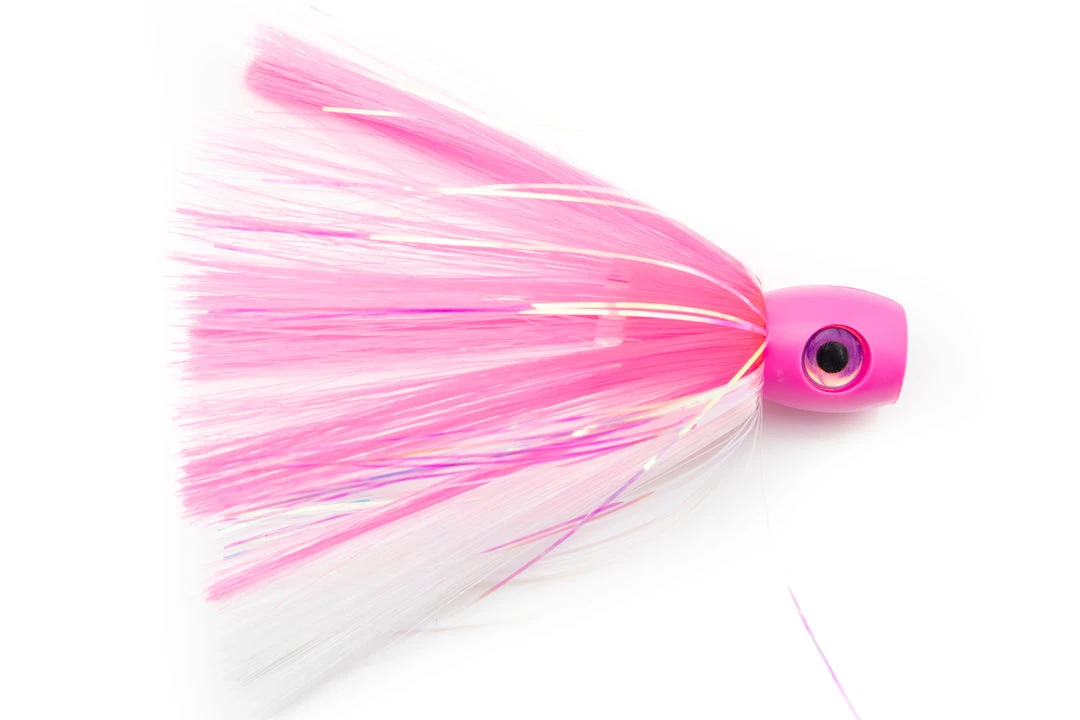 Chugger head style lure tied with hair and “Bling”. Normally fished on the surface rigged with ballyhoo or strip bait, but can be fished on it’s own too. 6” total length.