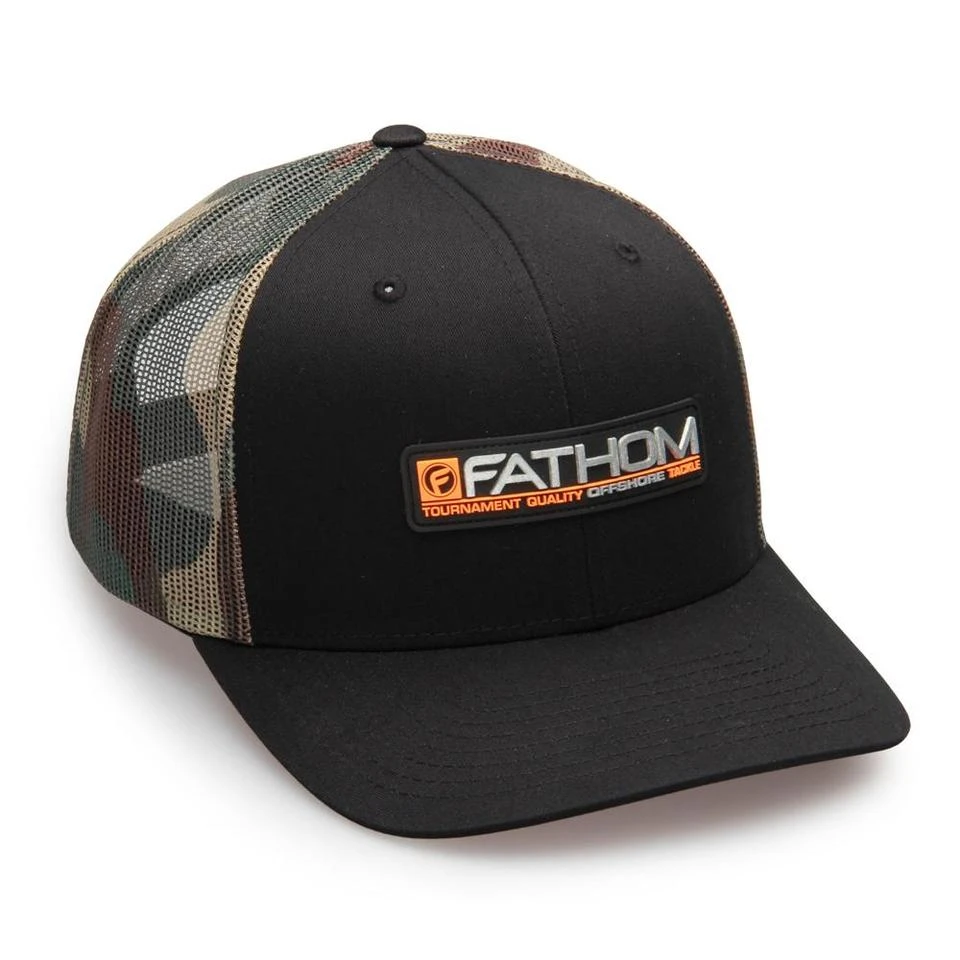 Camo mesh back trucker featuring 3D hi-vis orange and metallic rubber patch applique.
