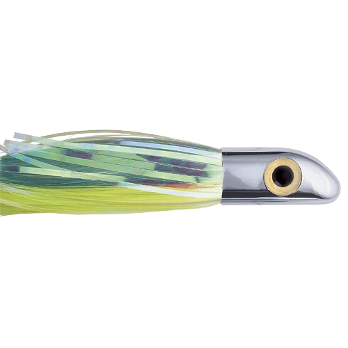 Just place it over a small to medium-sized Ballyhoo and watch it swim below the waters’ surface. The Hoo-La Hood® with chrome plating for long-distance flash, has been scientifically designed and weighted to allow fishermen to troll natural and artificial Ballyhoo at speeds up to 12 knots. Minimizes “washout” and makes rigging extremely easy. Ideal for Tuna, Wahoo, Dolphin, Sailfish, Marlin and King Mackerel. Hoo-La Hood® measures 7-1/8″ and weighs 1-7/8 oz.