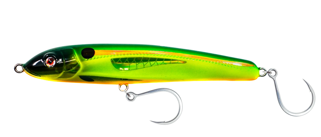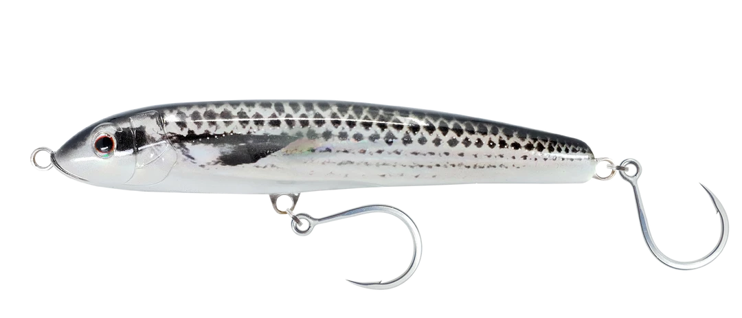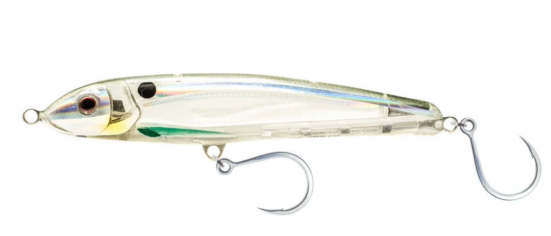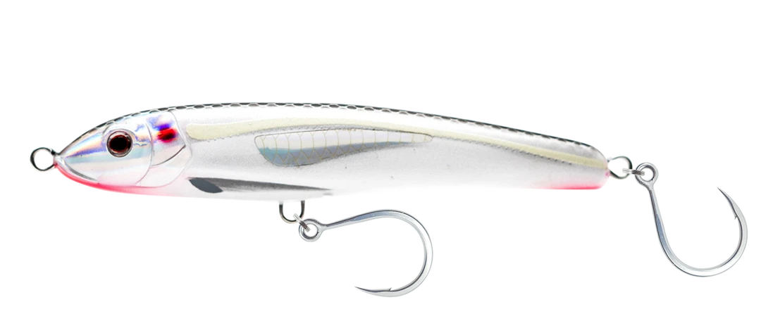 Riptide 105 Long Cast Stickbait. 4″ and 1.5oz. Gorilla Through Wire system for Ultimate Strength and fitted with super strong inline single hooks. When bluefins are keyed in on small sandeels and other small profile baits, this is an excellent choice. Ideal when casting for Tuna, Striped Bass and Yellowtail.Â