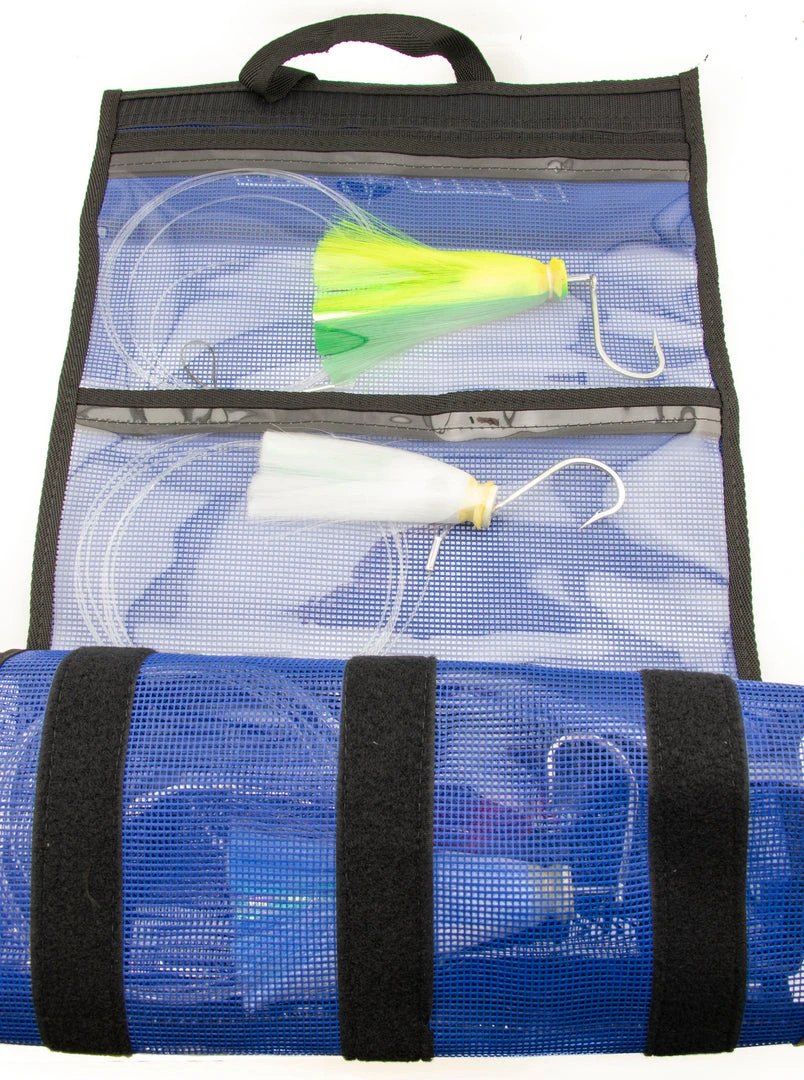 These “Six Shuter” rigged kits come rigged & ready with 6 Joe Shutes. We offer these in different weight configurations and rigging styles to suit your specific fishing needs! The basic “standard” rigging for these uses a “pin-rig” (rubber band) ballyhoo rigging style with Momoi monofilament and a Mustad hook. Our PRO SERIES rigging features a 20 foot long Fluorocarbon leader with a Wind-On Swivel, and utilizes a “wire-rig” system for attachment of the ballyhoo with 12-14″ of wire out of the crimp. Comes in a convenient roll-up 6 pack lure bag!