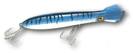 The Flying Squid is an improved pencil popper with features not seen before on production surface lures. The fins at the head end allow for greater distance when casting into a head wind because of their stabilizing influence which virtually eliminates wobble and therefore cuts way down on wind resistance. The fins also cause substantially more turbulence when the lure is worked, due to the increased square inches of lure body slapping the surface water as it is “popped”, and pencil poppers are all about commotion on the surface. You will quickly notice how much easier it is to work this lure, and how much value the fins add to the total package.
