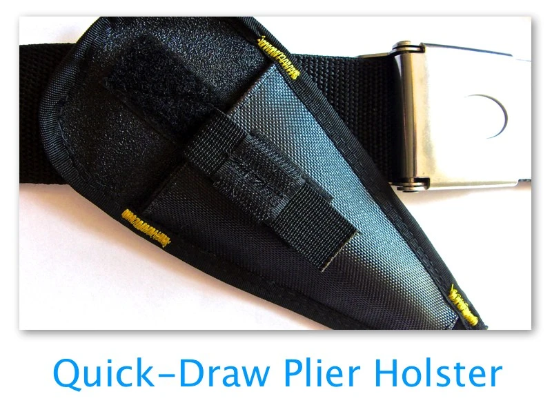 The RHF Quick-Draw Plier Holster is a completely different approach to carrying and using pliers.  The holster is angled, which makes plier removal and return easier than any standard vertical plier holster.  No more getting caught up in your jacket.  Our holster is also easier on the body.  Instead of being further back on your hip, it gets placed right up front closer to the buckle, saving your shoulder the effort of reaching and struggling to find the holster.  The interior is a textured gritty material that stops your pliers from sliding out and there’s also a reverse Velcro lock.  It goes from bottom to top, so you have the option of using it or not and it never gets in the way when you return the pliers.  All these features combine to make the RHF Quick-Draw Holster super-smooth and easy to use.