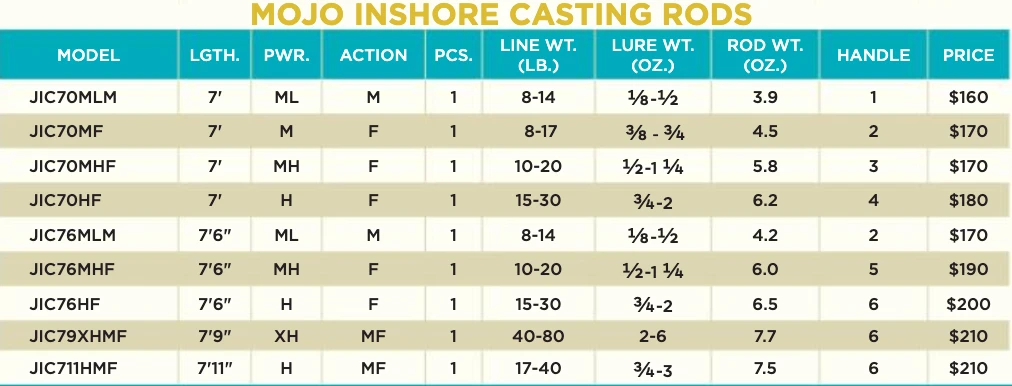 - Designed for inshore specific techniques, the Mojo Inshore series puts exceptional performance rods in angler’s hands at an affordable price