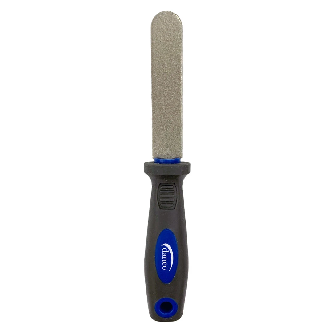 - Double sided diamond file has 400 and 600 grit surfaces with a hook channel