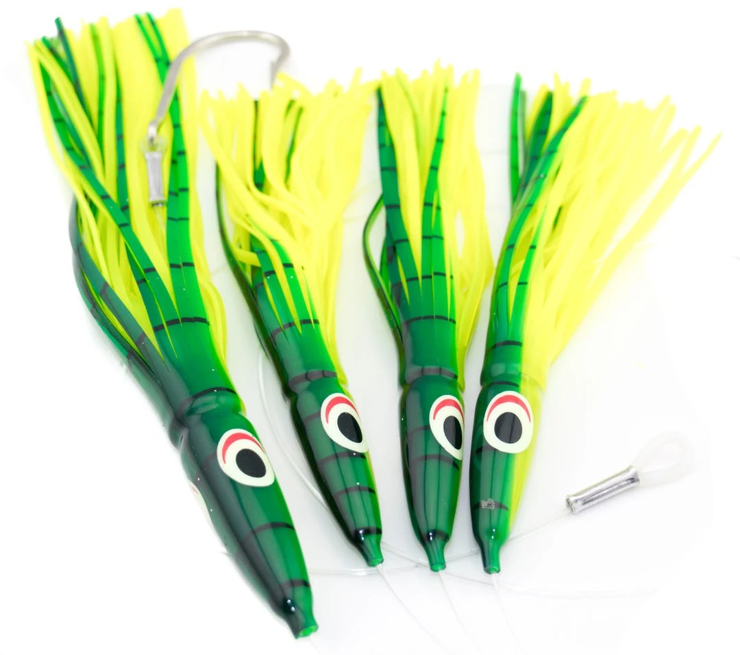 Pelagics won’t be ready for this “attack of the clones” when they get hit with the dark side of the force from our “clone blaster” daisy chain. These chains are a great addition to the spread for any sea conditions. With weighted heads, they really excel on rougher days. This chain is rigged with 3 U.S. made Tuna Clones as leading lures, and one larger Bigeye Clone as the stinger bait. Yellowfin tuna, bigeyes, mahi-mahi, and albacore won’t be able to resist. These are rigged on 200 lb. monofilament, with a heavy duty Mustad hook, twisted, and precision double-crimped on a bench crimper for additional strength with chafe protection on the hook and leading loop.Â