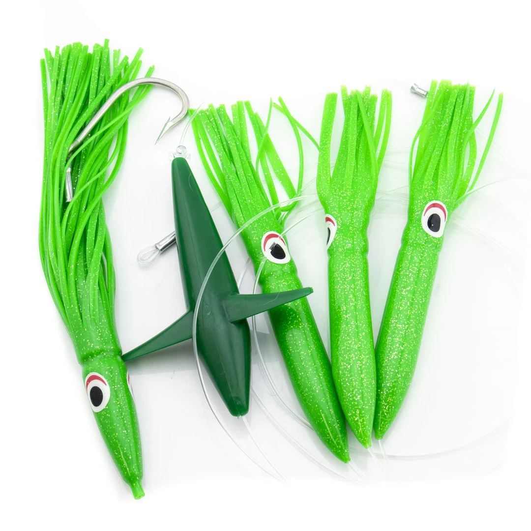 Similar to our “Exciter” splashing daisy chains, but these have a weighted bigeye clone as the stinger bait. With the additional weight of the clone, this chain is a great choice to use in choppier conditions. Aside from running in chop, they do work well in calm conditions when you’re looking for something that won’t skip as much. This chain can be run effectively in just about any position in the spread. Yellowfins, Bigeyes, and big Mahi are sure to love them.