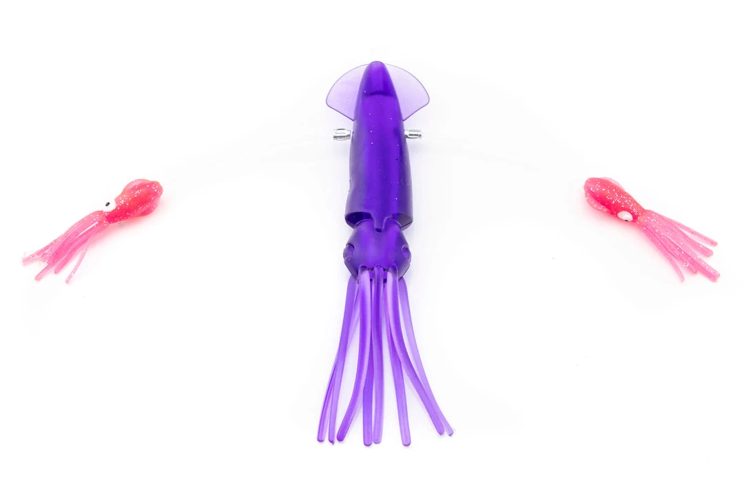 Our custom rigging is the best in the business. This daisy chain teaser is built using junior floppy squids. This is an excellent chain for Northeast tuna fishing. The ball bearing snap swivel at the end allows you to attach any lure of your choice. For tuna, we recommend adding a hook bait with a 5 foot leader. For billfish, a hookless teaser with a 2-3 foot leader is perfect.