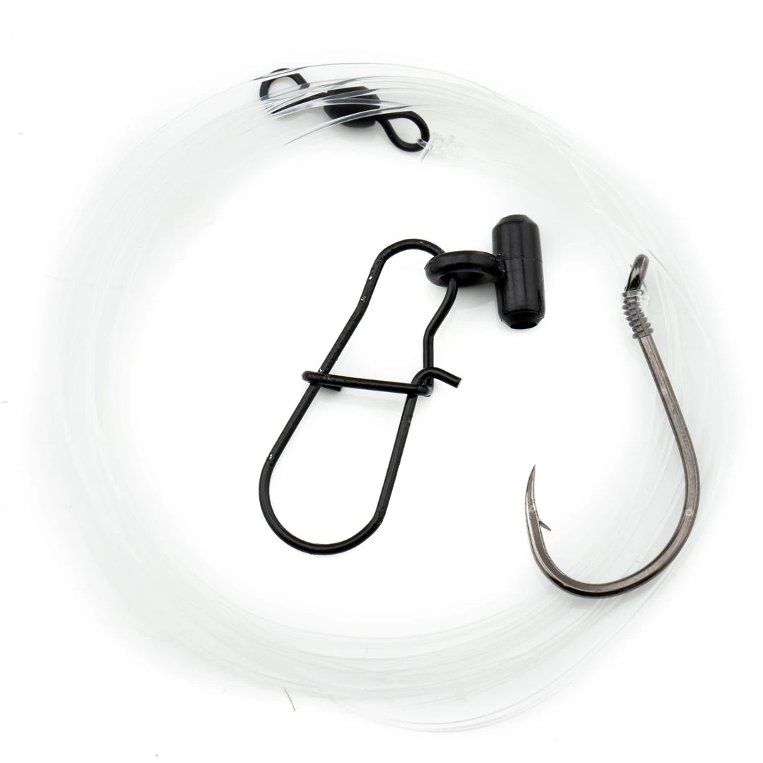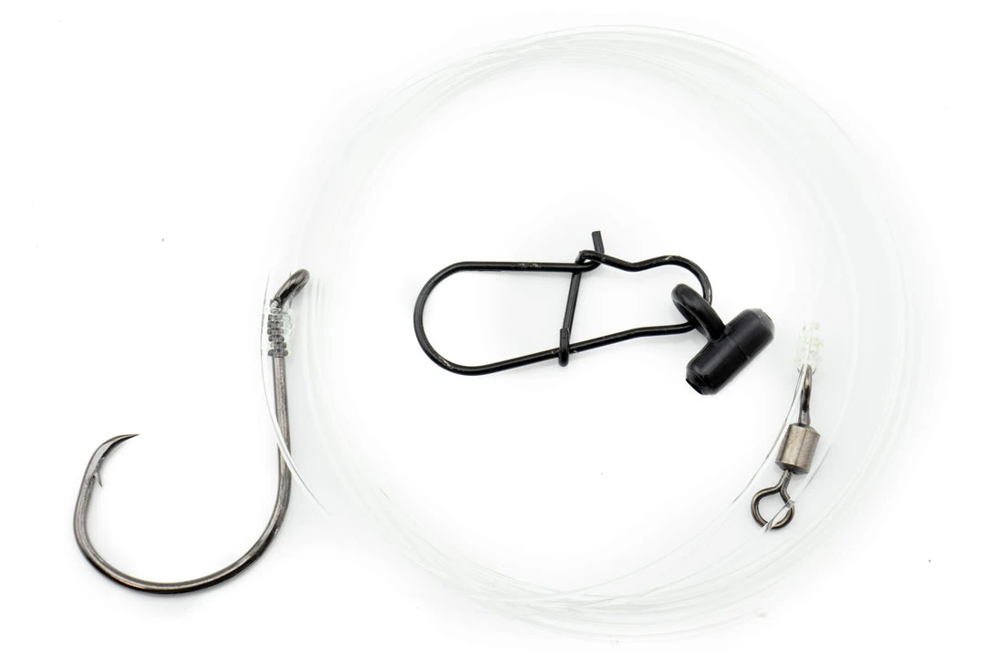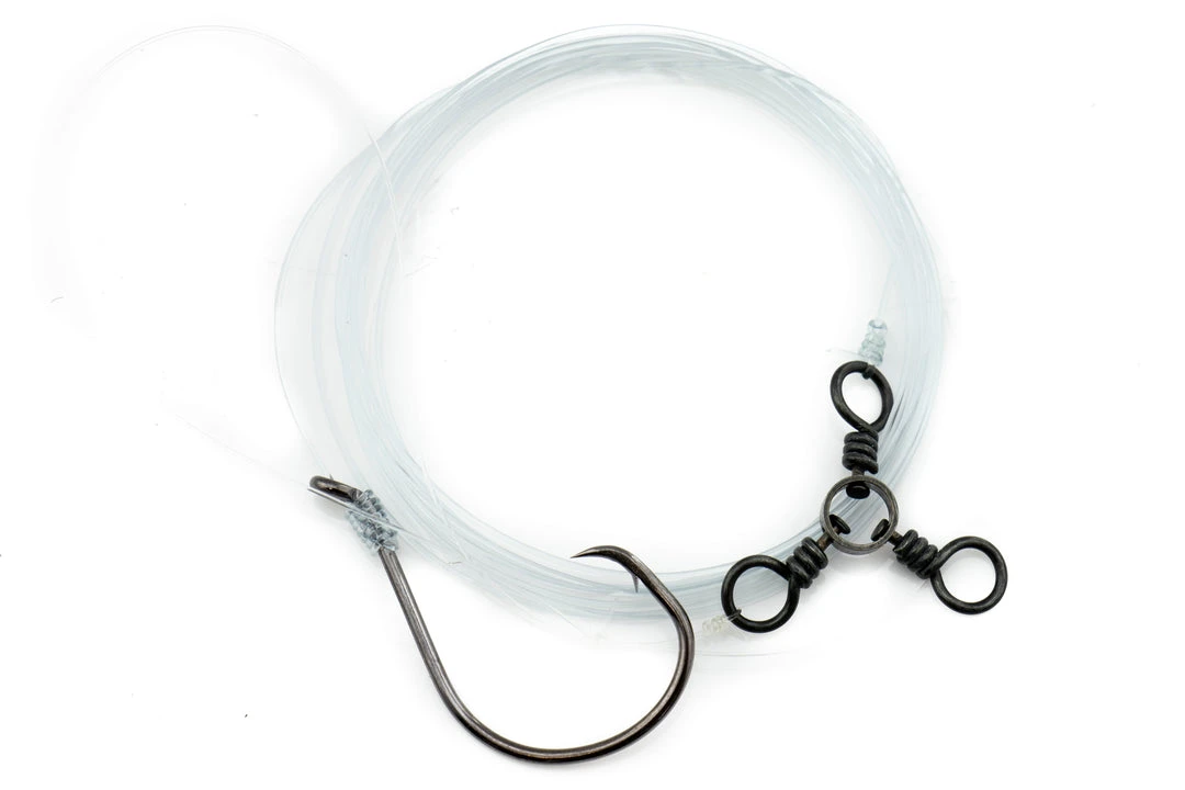 Nobody beats the quality of our custom rigs, hand tied right here by professional fishermen, with the right configuration to catch your target species. To suit your preference, our standard live bait striper rig features the option for either a 3-Way Swivel, or “fishfinder” slide method for sinker attachment. The 3-way rig has a light monofilament loop to attach your sinker, and the fishfinder sinker slide you would thread your main line through before tying it to the swivel. The leader is 6 feet long on this rig, with the option for an “octopus” J-Hook, or a circle hook. Whether you’re drifting the rips of the inlets, or the famed waters of Montauk Point, these rigs will do the job. This rig can also be used for live bait fishing in channels for big redfish.Â